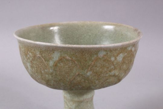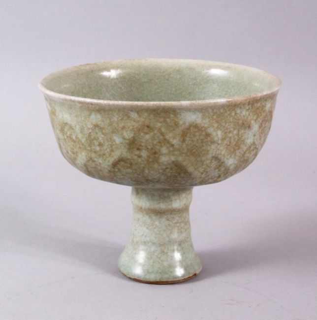 A CHINESE CELADON CRACKLE GLAZED PORCELAIN STEM DISH, the body with lappet style moulded decoration , 11cm high x 13cm wide.