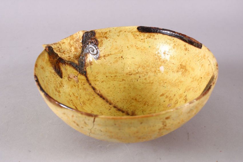 A GOOD IRAN STYLE POTTERY POURING BOWL, decorated with a yellow ground with brown splash decoration, 18.5cm