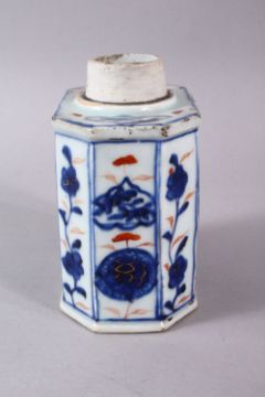 AN 18TH CENTURY CHINESE IMARI TEA CADDY, with panels of underglaze blue & iron red flora, 10.5cm x 8.5cm