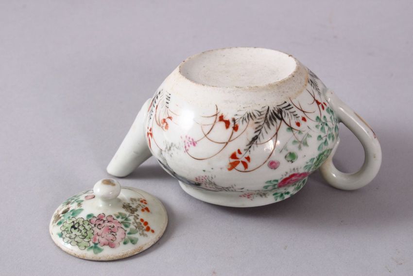 A SMALL CHINESE FAMILLE ROSE TEAPOT & COVER, decorated with native scenes of flora and birds, the base unglazed, 6cm high x 11.5cm wide.