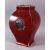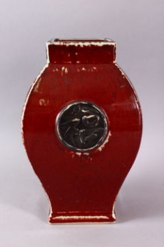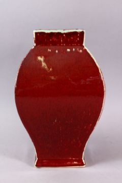 A CHINESE SQUAT SQUARE FORM SANG DE BOEUF PORCELAIN VASE, with a graduating glaze and a central roundel of calligraphy symbol, 29.5cm