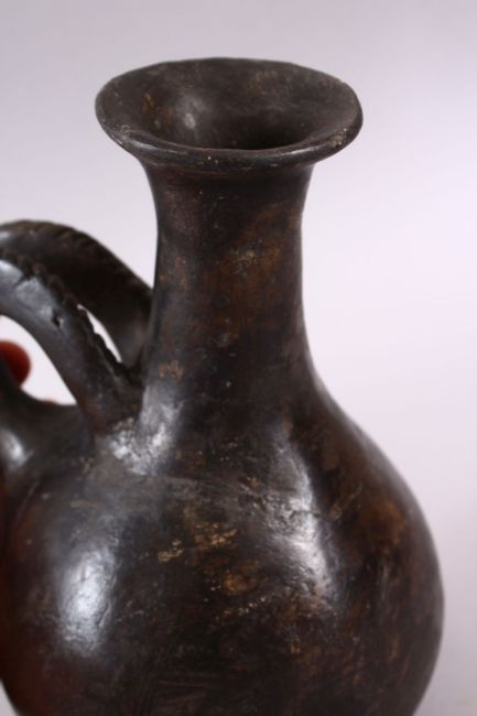 A GOOD EARLY AMLASH RYTON 1000BC POTTERY RAMS HEAD VASE, with a moulded base with a rams head handle, (AF)