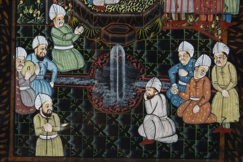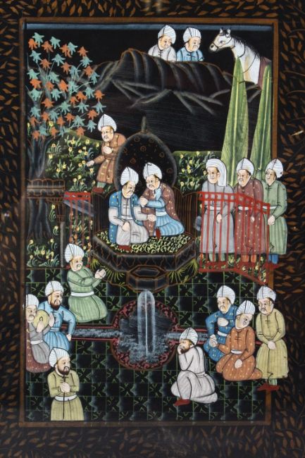 AN INDIAN MINIATURE PAINTING ON TEXTILE - depicting many figures and a horse in a garden setting, 33cm x 27cm