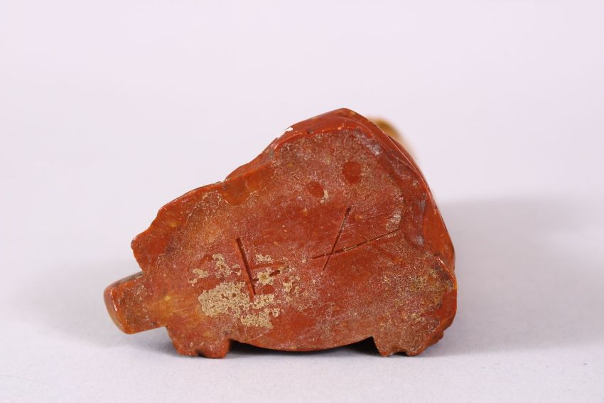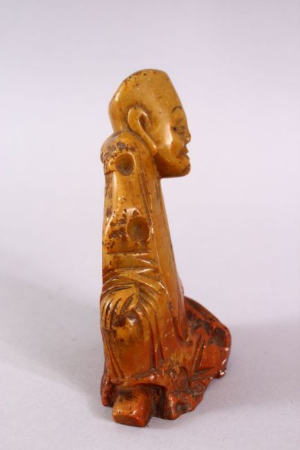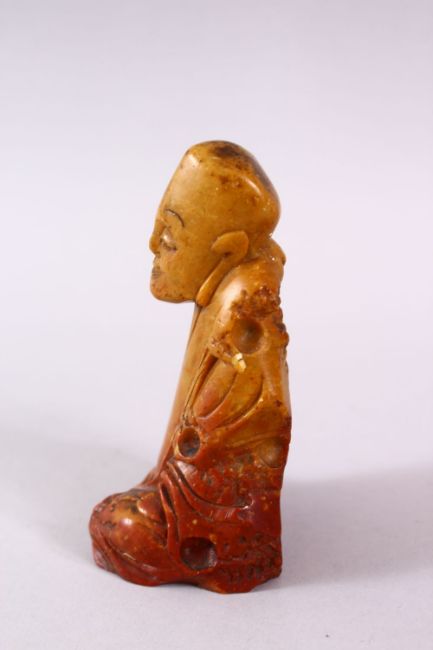 A CHINESE CARVED SOAPSTONE FIGURE OF A JOLLY MAN, in seated position, 11cm
