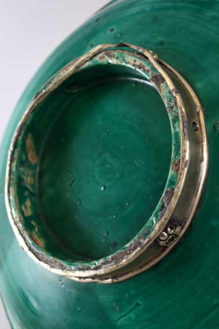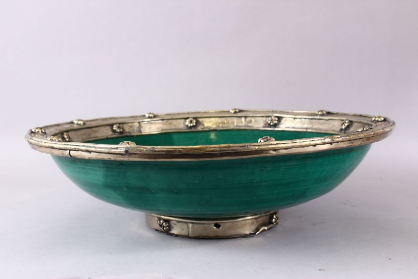 AN EARLY EASTERN GREEN GLAZED & WHITE METAL LARGE POTTERY DISH, the large dish glazed with a green hue, with a white metal mounting with floral boss decoration, 52.5cm diameter