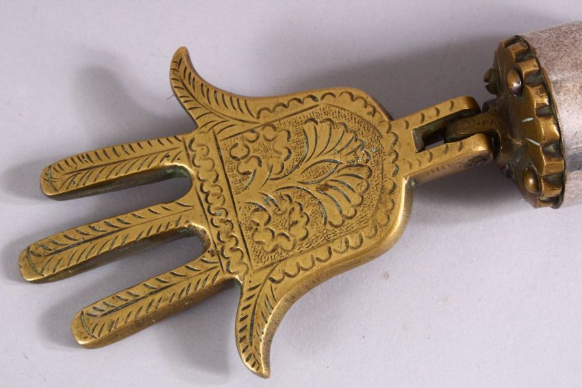 A JEWISH JUDAICA BRONZE HAND FORMED DOOR KNOCKER, with white metal mounts, each half approx 15.5cm