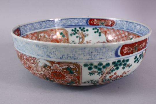 A GOOD JAPANESE MEIJI PERIOD PORCELAIN IMARI BOWL, with underglaze blue decoration of twin ho ho birds, amongst enamel decoration of cranes amongst waves and flora, 27.5cm diameter