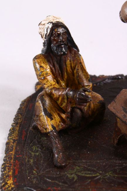 A TURKISH THEME BERGMAN STYLE COLD PAINTED BRONZE FIGURE - depicting two figures smoking and drinking at a low table, the underside marked "BERGM", 13cm wide x 10cm deep x 11cm high.