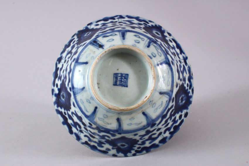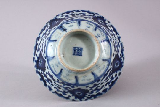A CHINESE MING BLUE & WHITE PORCELAIN BOWL, decorated with underglaze blue lotus design, the base with a seal mark, (AF) 17cm