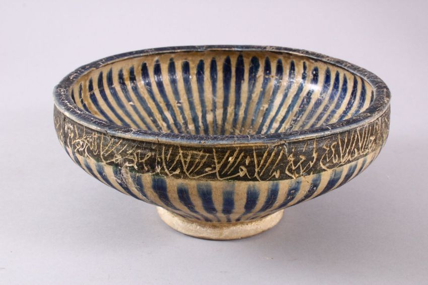 AN EARLY NISHAPUR POTTERY BOWL, the exterior with bands off calligraphy , with blue stripe decoration, 21cm diameter (af)