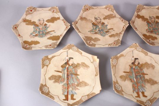 A SET OF EIGHT JAPANESE SATSUMA EARTHENWARE DISHES, 7 smaller plates and one larger dish, each decorated with figures / warriors, ther verso with gilt marks, 18.5cm &30cm.