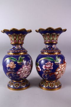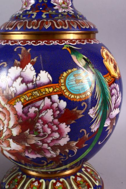 A PAIR OF 19TH/20TH CENTURY CHINESE CLOISONNE VASES, the bodies decorated with displays of native flora with birds and ruyi sceptre with calligraphy upon a deep blue ground, under a flared rim covers, overall 41cm high.