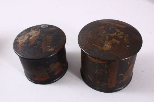 A MIXED LOT OF CHINESE 19TH / 20TH CENTURY LACQUER LIDDED BOXES, each with decoration of figures and or birds in landscapes, one with inlaid stone decoration, varying sizes and style ( 6 )