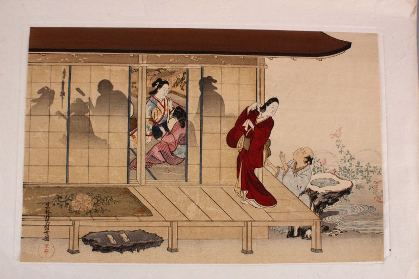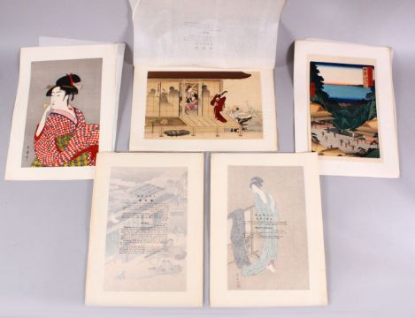 A SET OF FOUR JAPANESE WOODBLOCK PRINTS - FORMINGG PART OF A COLLECTABLE SERIES, each mounted to board with a tissue protection with a printed text to give appreciation to the artist and series, 38cm x 27cm