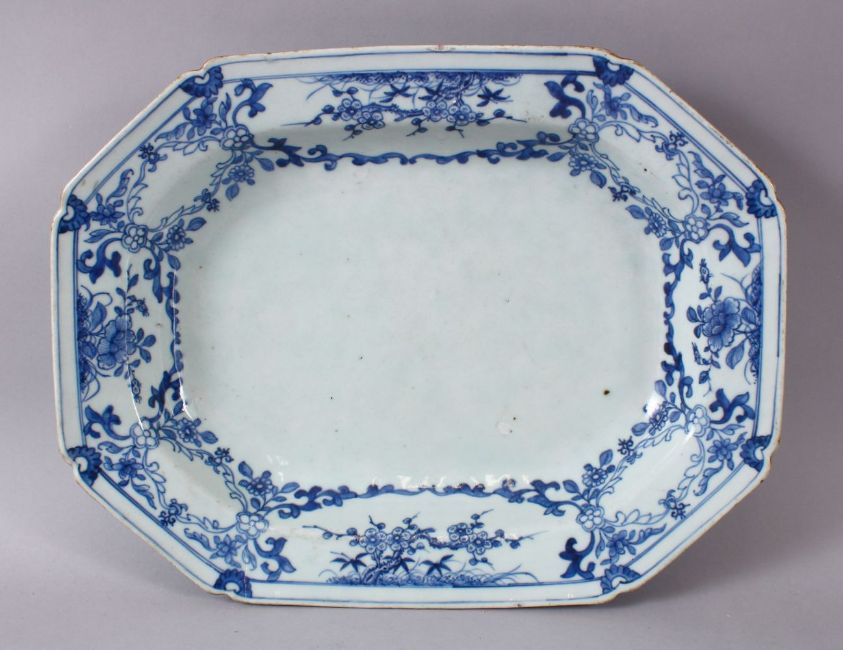 AN 18TH CENTURY CHINESE BLUE & WHITE PORCELAIN SERVING DISH, decorated with simple taste floral design, 37.5cm wide.