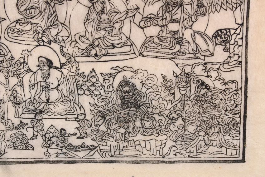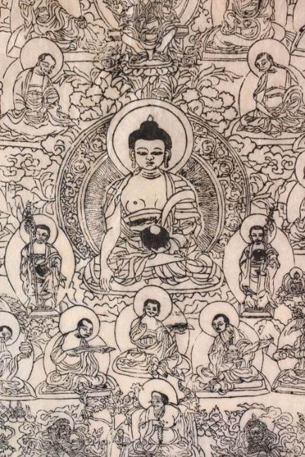 A TIBETAN PAPER THANKA RUBBING / BLOCK PRINT OF BUDDHA, depicting seated buddhas, taped to card, 62cm x 52cm.