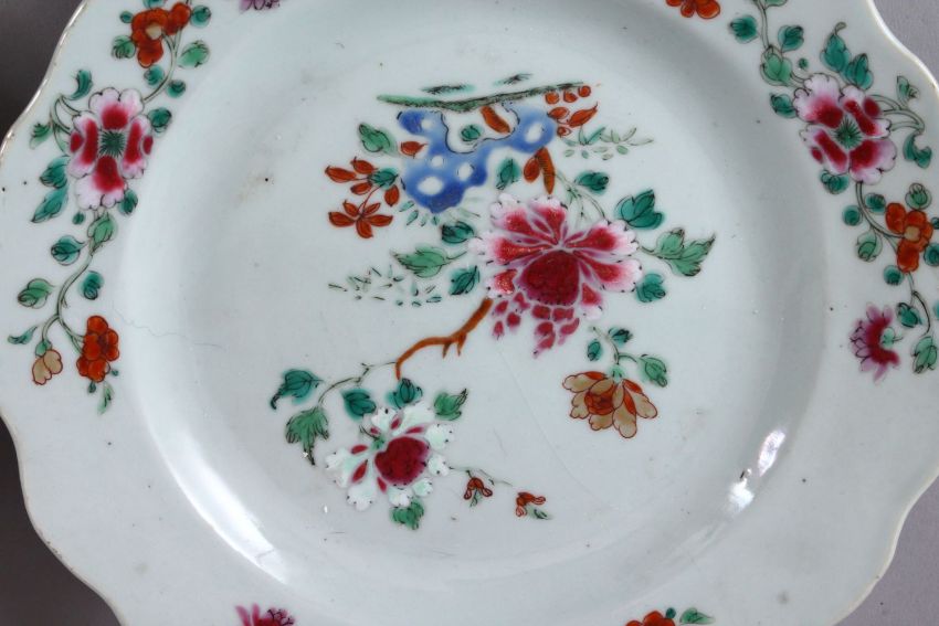 FOUR 18TH CENTURY CHINESE FAMILLE ROSE PORCELAIN PLATES, each decorated with floral spray decoration, 23cm.