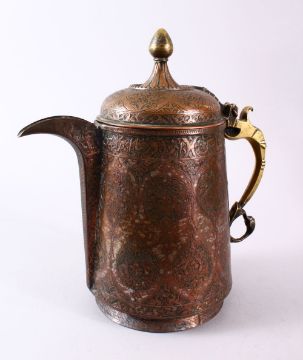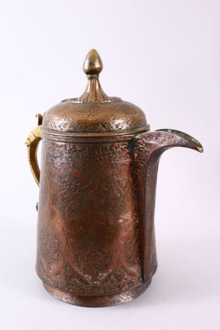 A 19TH CENTURY INDO PERISAN TINNED COPPER CALLIGRAPHIC JUG / EWER, the body with carved floral panels, traces of tin, with bands of Persian script / calligraphy, 29cm high