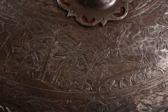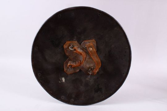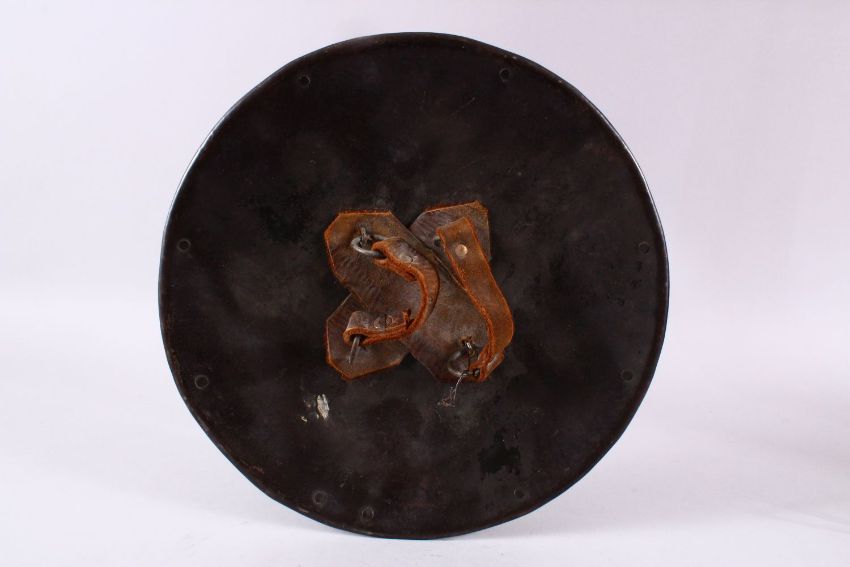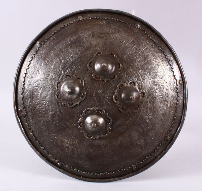 A 19TH CENTURY INDIAN CARVED STEEL CHILD'S SHIELD, carved with figures, animals and flora, four raised bosses, the verso with its leather straps, 30.5cm