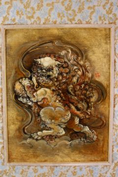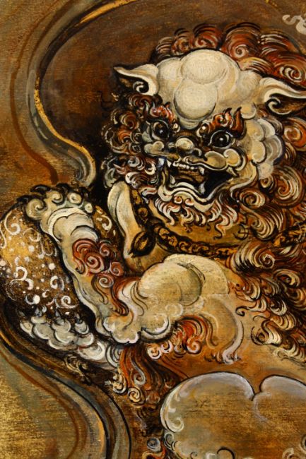 A GOOD CHINESE FRAMED OIL PAINTING OF A LION / FOO DOG, the dog in an upright position with its ball, the lower section with a signature nd sealed mid right, framed but unglazed, 55cm x 44cm