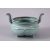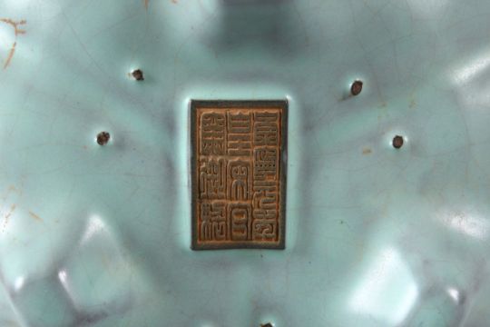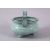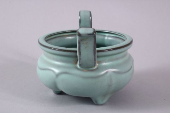 A CHINESE SONG STYLE CELADON POTTERY TWIN HANDLE CENSER, the body with a pale green celadon glaze, with twin moulded handles, the base with an unglazed seal mark, 9.5cm high x 15cm wide.