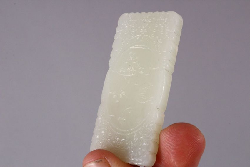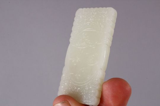 TWO CHINESE CARVED JADE TWIN FISH & IMMORTAL PENDANTS, one carved in the form of twin fish, 5cm, togeether with a carved tablet pendant of an immortal with elephant and lotus, 5.5cm