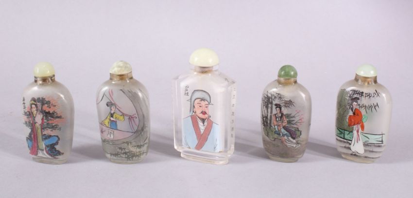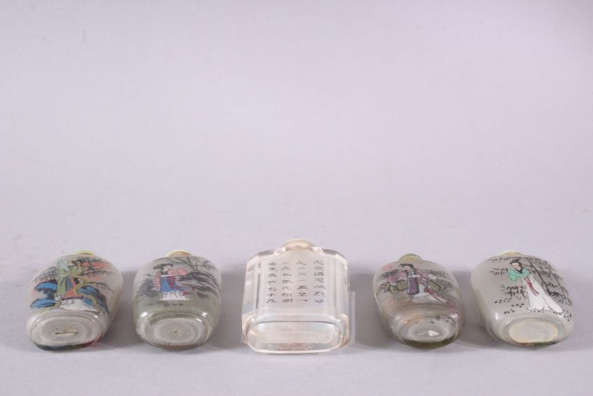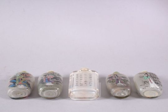A MIXED LOT OF 5 CHINESE REVERSE PAINTED SNUFF BOTTLES, each with decoration of figures mostly in landscape settings, some with calligraphy,largest 9cm high down to 7.8cm (5)