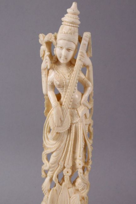 A 19TH CENTURY INDIAN CARVED IVORY FIGURE OF SARASWATI, 19cm high.