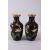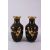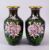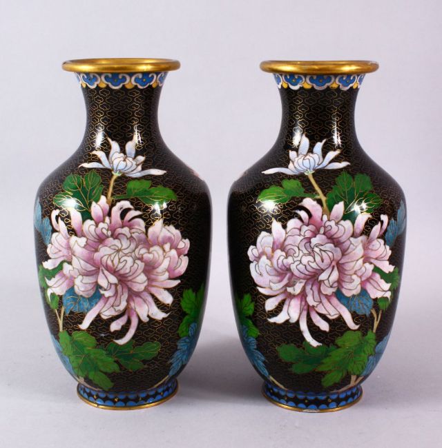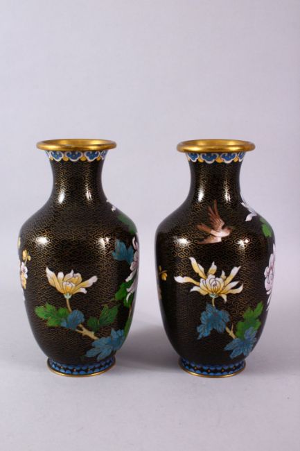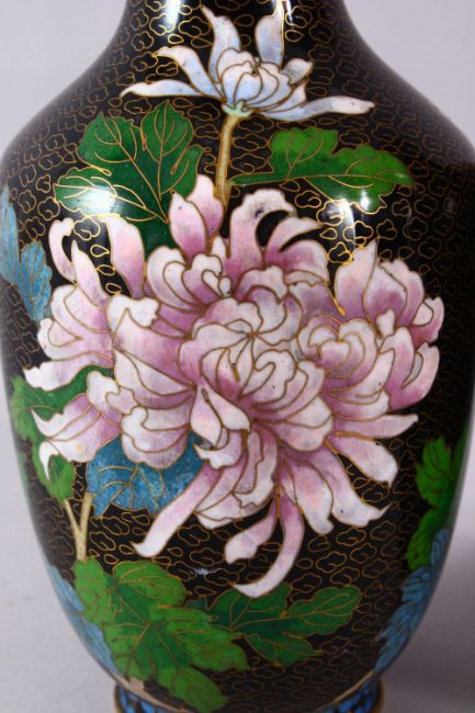A PAIR OF CHINESE CLOISONNE BLACK GROUND VASES - each with a black ground and native display of lotus, 21cm high.