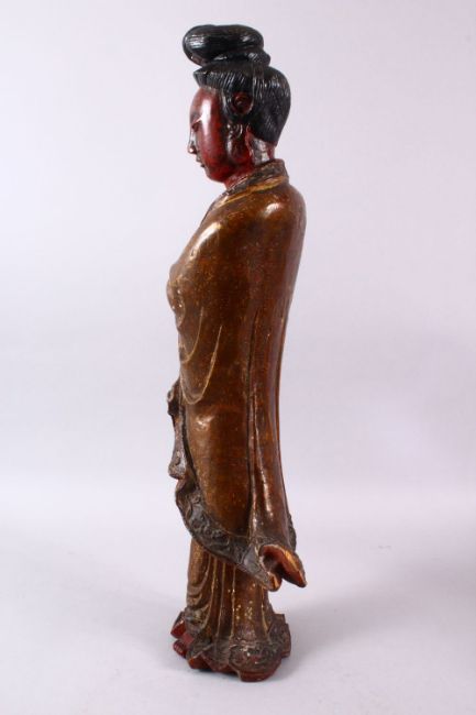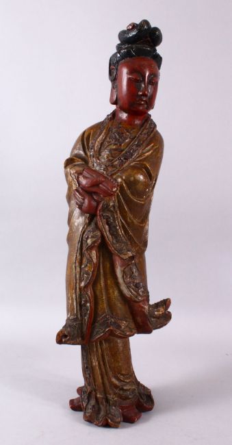 A LARGE CHINESE WOOD & LACQUER FIGURE OF GUANYIN, stood holding a scroll with her hands crossed, 58cm