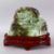 A LARGE CHINESE JADE STONE LANDSCAPE CARVING, depicting a native landscape built upon a mountainous setting, with a wooden base, 18cm high x 25.5cm wide ( carving alone )