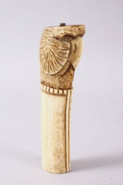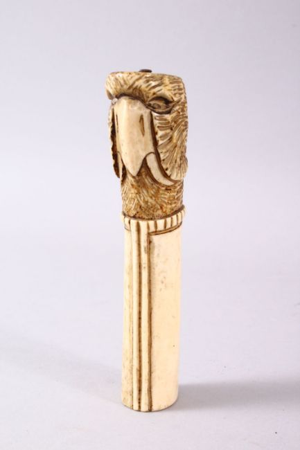 A 19TH CENTURY INDIAN MUGHAL CARVED IVORY BIRD FORMED DAGGER HANDLE, 13cm