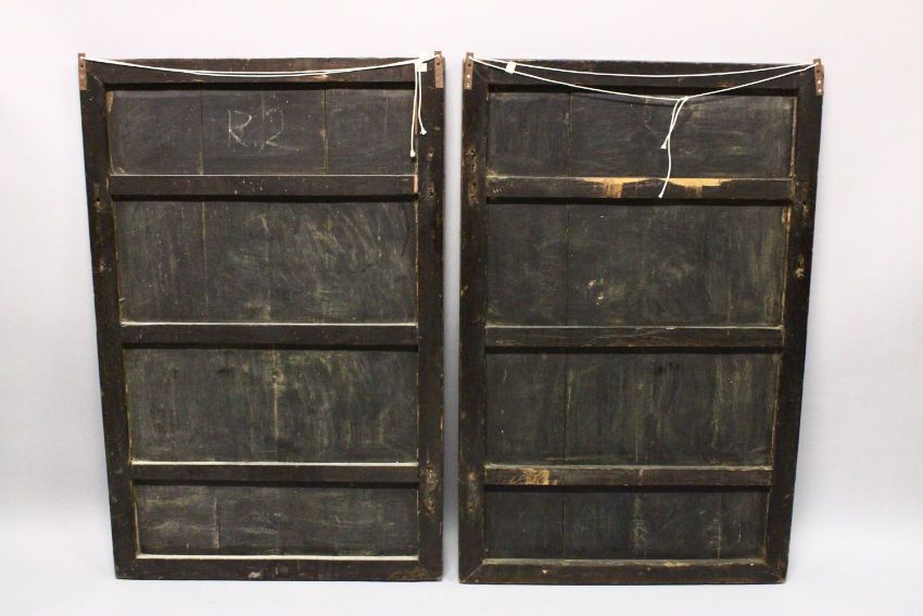 A PAIR OF CHINESE CARVED AND PAINTED HARDWOOD PANELS, depicting dragons each holding the pearl of wisdom amongst stylised clouds, a smaller dragon at the foot of each, 118cm x 76cm.