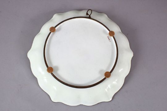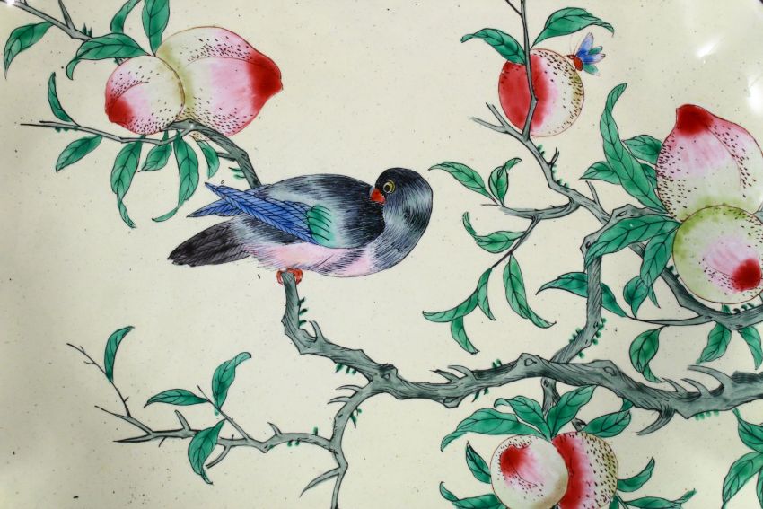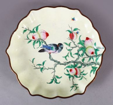 A CHINESE ENAMEL PEACH BLOOM DISH, the dish with a pale yellow ground depicting a bird seated in the branches of a peach tree, 22cm.