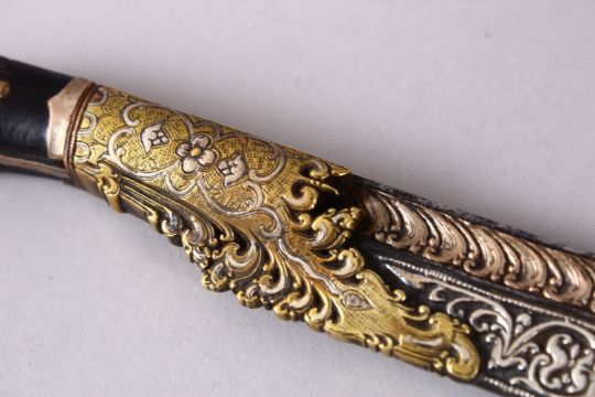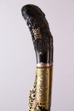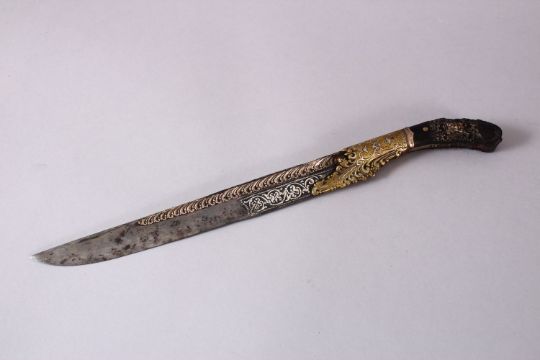 A FINE 18TH CENTURY SRI LANKAN PIHA KEATA DAGGER, with carved horn hilt, with gold, copper and silver inlaid decoration, 30cm long.