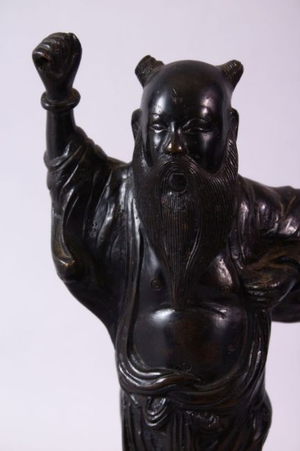 A GOOD 19TH CENTURY BRONZE JAPANESE FIGURE OF AN IMMORTAL, with long flowing beard, arm raised on a pierced base, 32cm high.