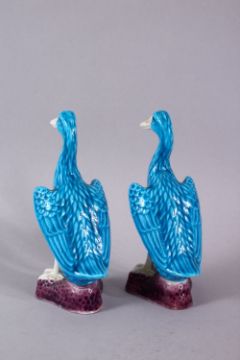 A PAIR OF CHINESE TURQUOISE GLAZED FIGURES OF DUCKS, stood upon stylized rocky bases with turquoise and aubergine glaze, 12cm high