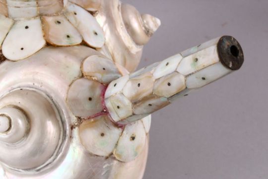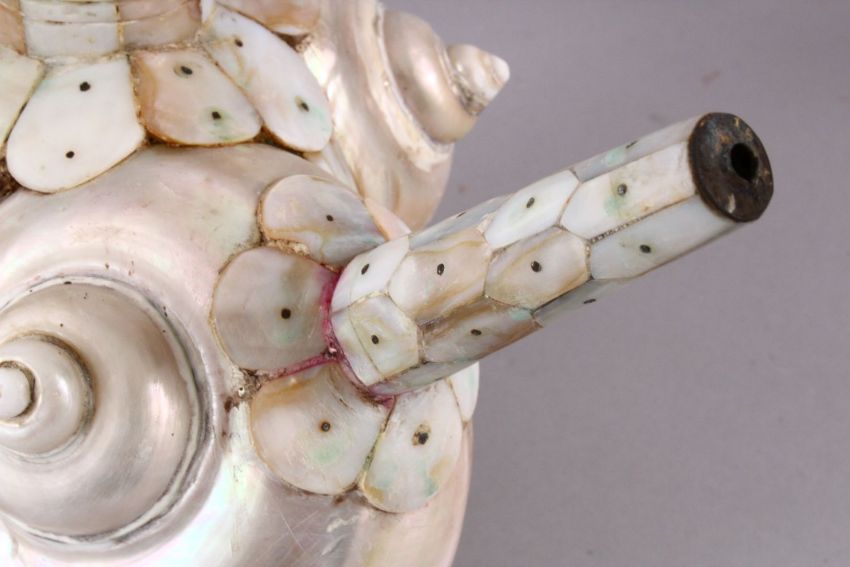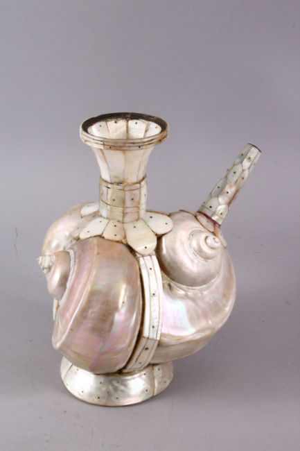 A UNUSUAL 18TH CENTURY INDIAN GOA INLAID MOTHER OF PEARL SHELL FORMED WATER EWER, 24CM X 22CM ,