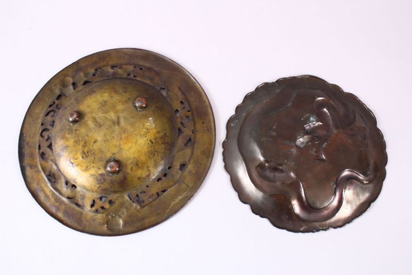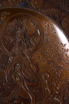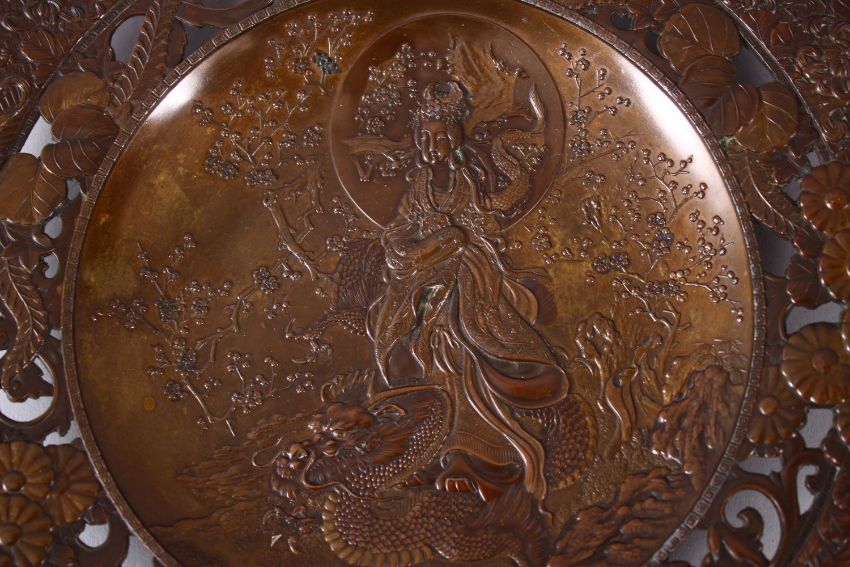TWO JAPANESE MEIJI PERIOD SOFT METAL / ANTIMONY DISHES - KWANNON - DRAGON, the larger in fine detail depicting kwannon goddess stood amongst cherry blossom and a dragon, 24cm diameter, the other depicting a dragon amongst waves, 19.5cm