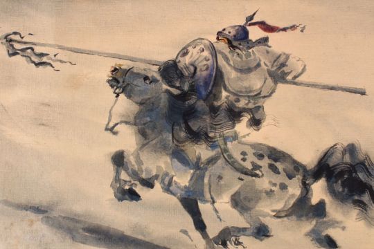 A CHINESE PAINTING ON PAPER - WARRIOR ON HORSEBACK, the painting depicting a warrior in battle upon horseback, the left side with calligraphy and seal marks, 37cm x 24cm