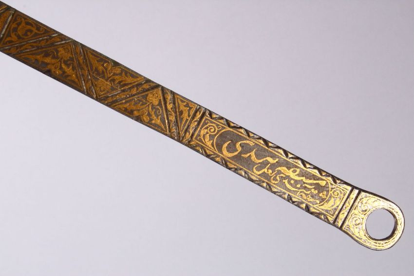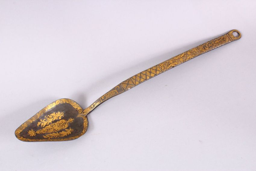 AN OTTOMAN / ISLAMIC GOLD INLAID RELIGIOUS CALLIGIRAPHY SPOON, inlaid gold floral motif and calligraphy, the verso with carved signature calligraphy, 44cm.