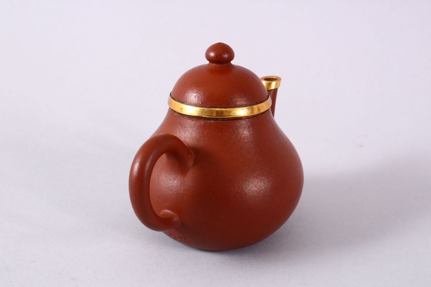 A CHINESE YIXING CLAY & GOLD METAL MOUNTED TEAPOT & COVER, the body mounted with gold coloured metal, the side of the pit with an incised signature beneath handle, 9.5cm x 13cm wide.