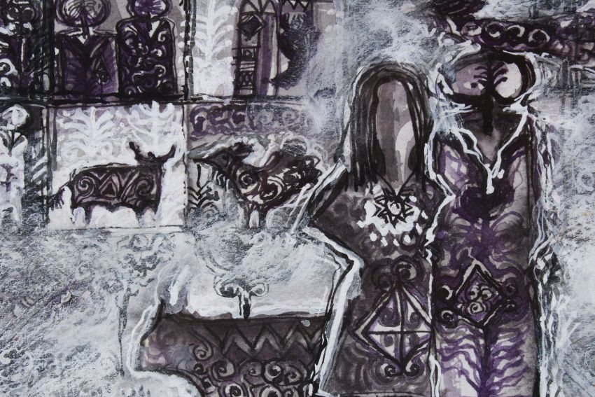 A SYRIAN CONTEMPORARY PAINTING - BY ISRAM ABOUD 2002 - depicting figures and animals in town settings, 20cm x 15.5cm ( not inclulding the frame )