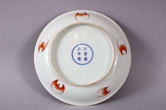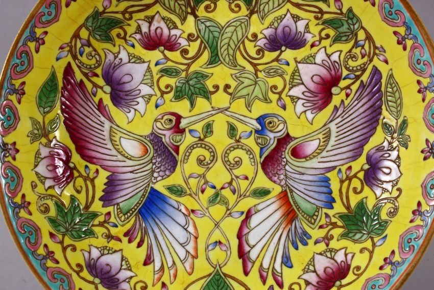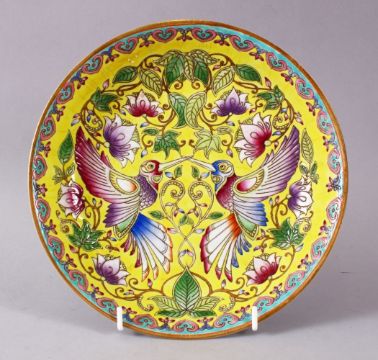 A CHINESE FAMILLE JAUNE OR YELLOW GROUND PORCELAIN DISH, decorated with twin birds amongst flora, with ruyi borders and bats underside, with a six character mark, 21cm