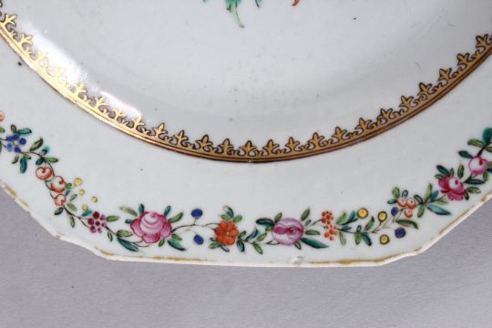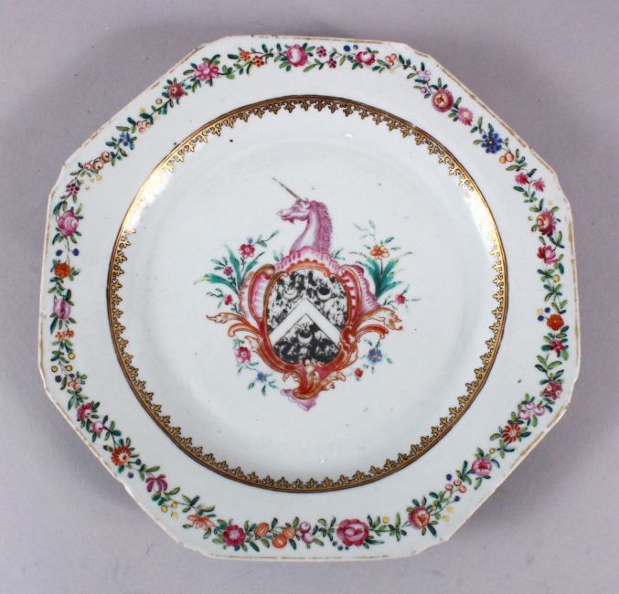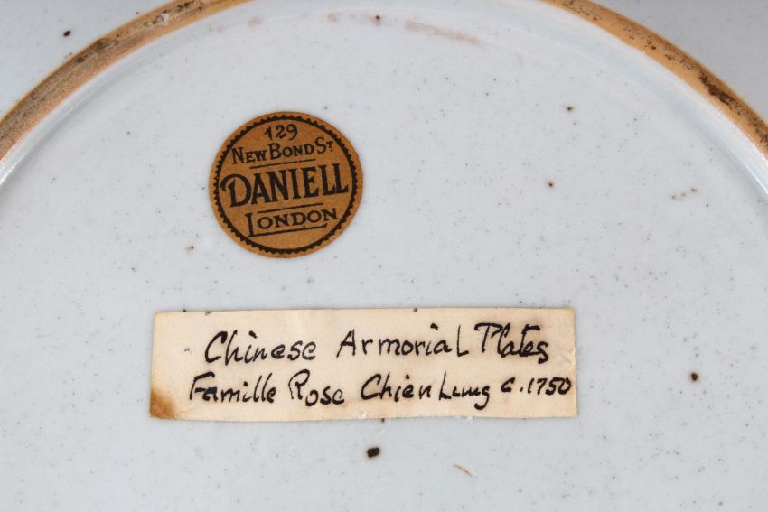 AN 18TH CENTURY QIANLONG CHINESE AMILLE ROSE ARMORIAL PORCELAIN PLATE, decorated central with a horse head crest, with floral border decoration, with an old Daniell retailers label 22cm