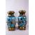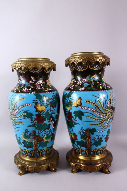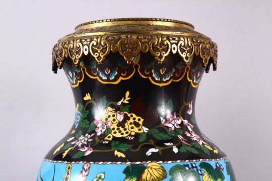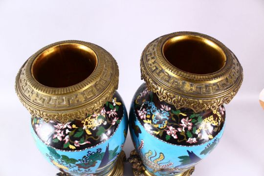 A LARGE PAIR OF 19TH CENTURY JAPANESE CLOISONNE & ORMOLU MOUNTED VASES, the body of the blue ground vases decorated with ho ho / phoenix birds amongst autumnal leaf decoration, the upper shoulder section with a black ground depicting scenes of Shi-shi dogs playing amongst lotus, with mounted ormolu dragon handles, 47.5cm high each.
