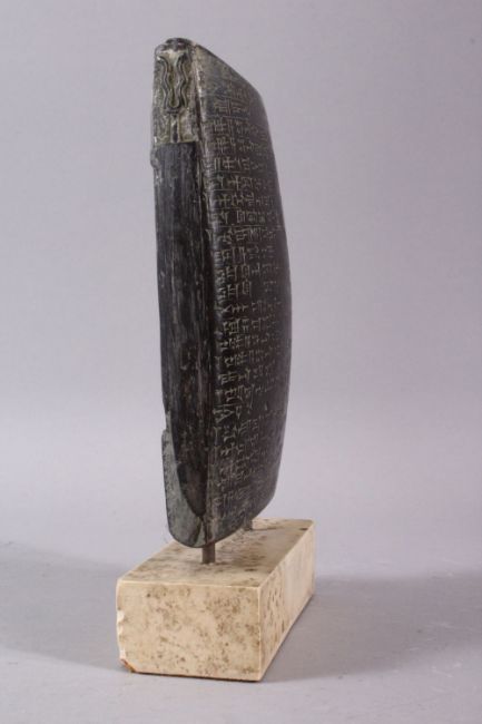 A MESOPOTAMIAN BABYLONIAN STYTLE CARVED BLACK TABLET, carved with two figures and objects, with script, mounted to a stone base, 17cm x 11cm ( tablet alone )