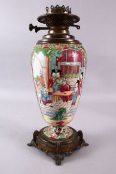 A 19TH CENTURY CHINESE CANTON FAMILLE ROSE PORCELAIN OIL VASE / LAMP, with panel decoration of figures in balcony settings, further decorated with panels of birds with surrounding decor of butterflies and scrolling foliage, 41cm