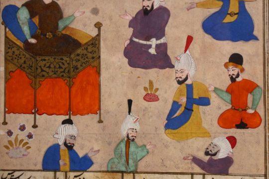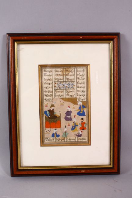 A QAJAR MINATURE PAINTING ON MANUSCRIPT - depicting figures before a prince, in calligraphic manuscript page, framed33cm x 25cm
