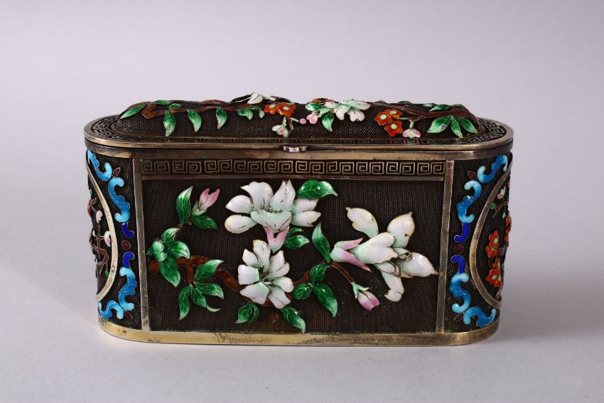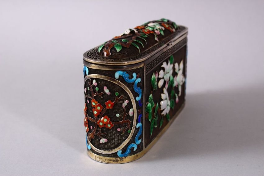 A CHINESE SILVER & ENAMEL LIDDED BOX, with enamel decoration of native flora, base marked silver, 15cm